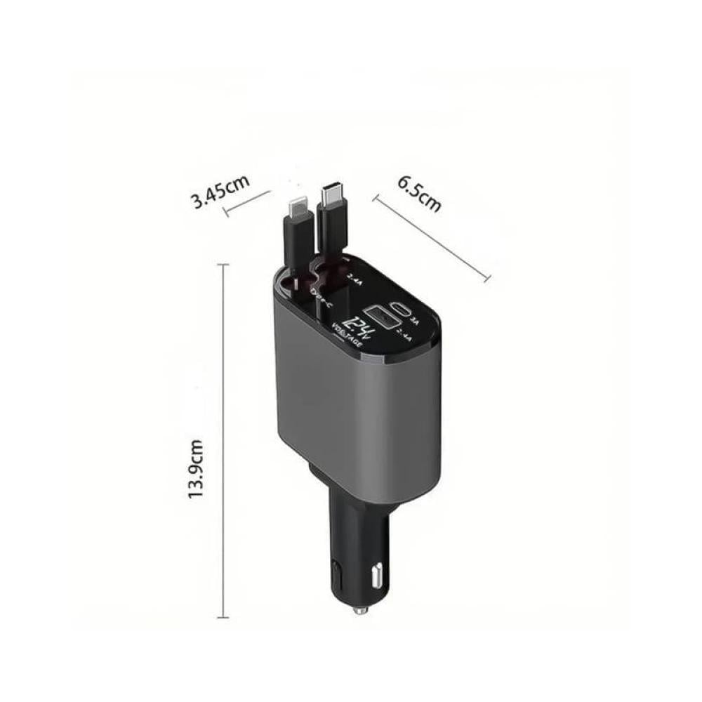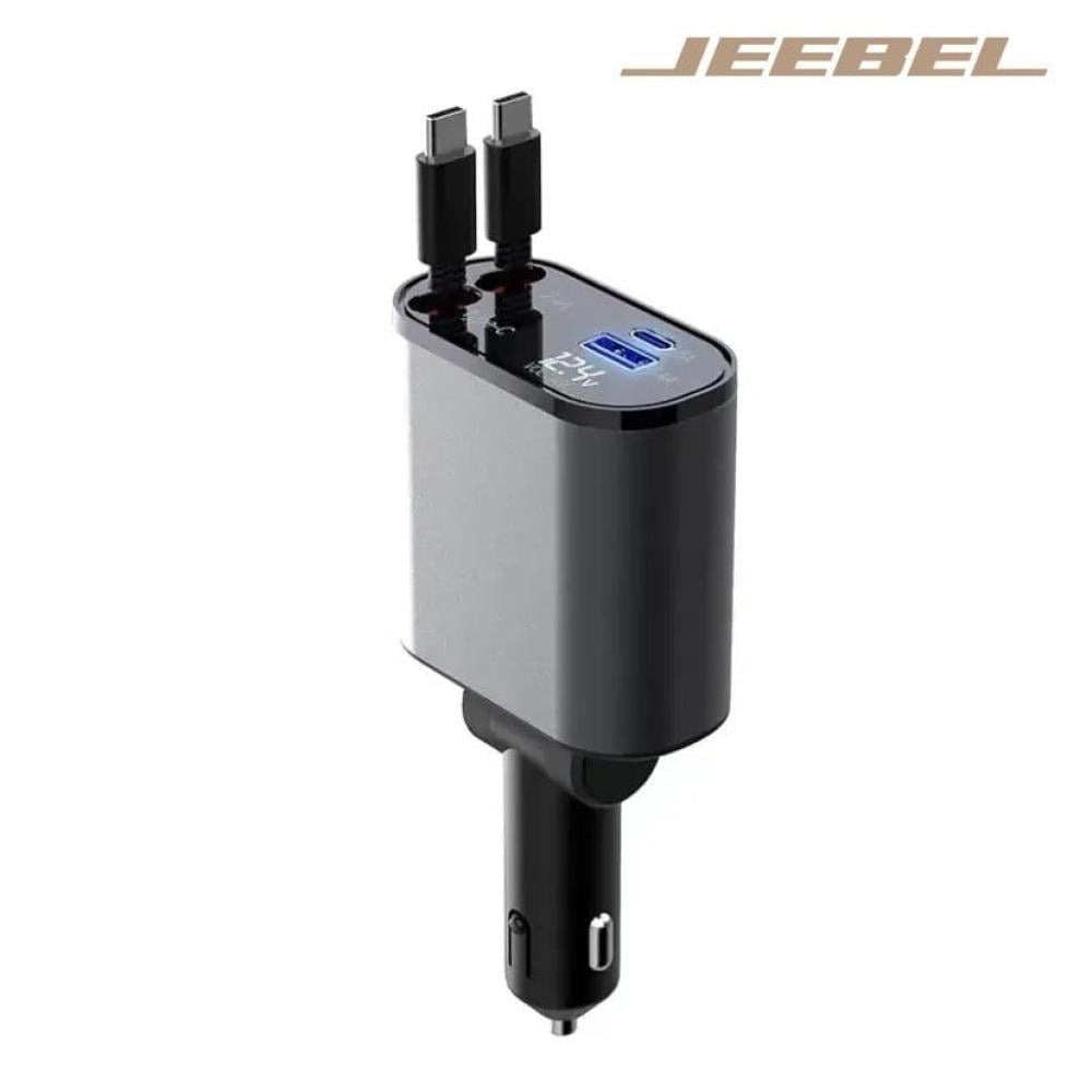 شاحن سيارة متكامل من Jeebel يقدم لك أداءً فائقًا وشحنًا سريعًا لجميع أجهزتك أثناء القيادة. مزود بكابل Lightning وكابل Type-C قابلين للسحب بطول 80 سم، بالإضافة إلى منفذ USB ومنفذ Type-C إضافيين. يتميز بتصميم عملي قابل للتدوير وشرائح ذكية لحماية جهازك من الحرارة والشحن الزائد. خيار مثالي للتنقل والاستخدام اليومي.